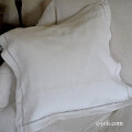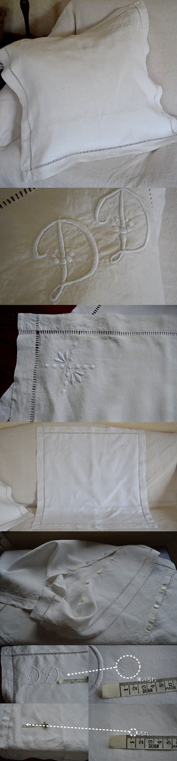 少し生成りの、しっかりとした麻生地に、白の手刺繍が素敵なクッションカバーです♪ 写真のような汚れが若干ありますが、気にならない程度で、全体的にきれいな印象です。 ※在庫は左ロゴのみです。洗濯済みです。