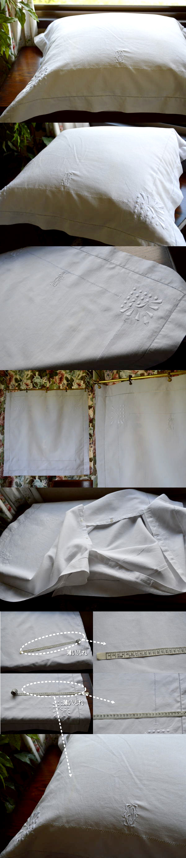 しっかりとした厚みの綿麻生地に、丁寧な手刺繍のデザインが美しいアンティーククッションケースです♪ 写真のような薄い汚れがありますが、雰囲気を損なわない程度です。 ※洗濯済みです。