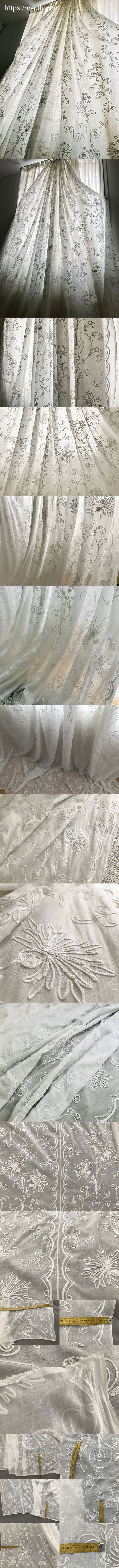 繊細な綿ローン地に、チェーンステッチのコーネリー刺繍のアンティークカーテン。2枚の生地をつなぎ合わせて195cm幅の天蓋カーテンに作り上げられていて、とても素敵。貴重なアンティークです。裾は折り返しているのみで、裾始末していただく必要があります。リメイクしてお使いいただいても。写真のように、ほつれや汚れがありますが、雰囲気を損なわない程度です。 ※洗濯済みです。