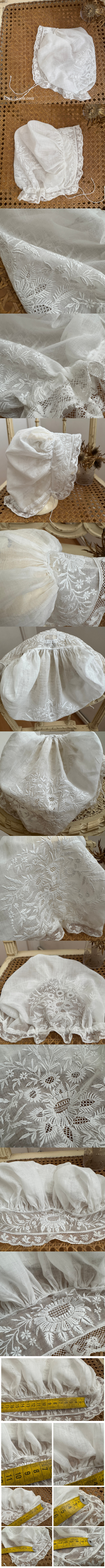 やわらかな綿ローンに、ホワイトワーク手刺繍とレースが美しく施されたアンティークボネ。