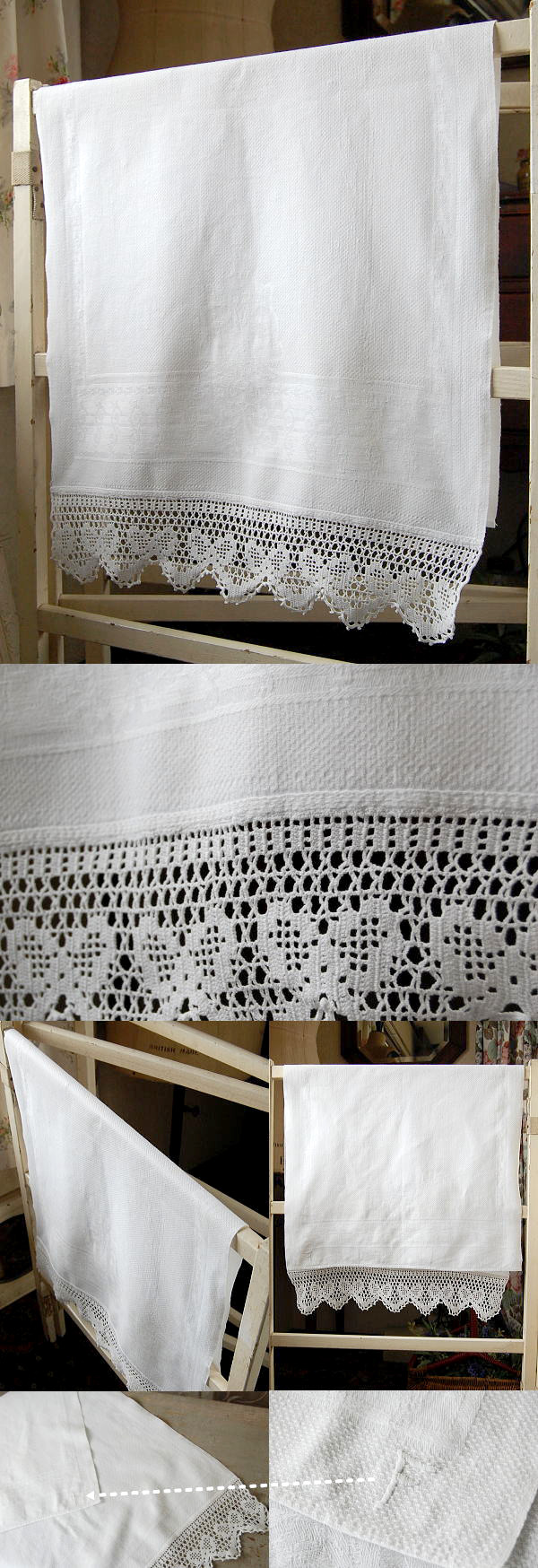 しっかりとした厚みの麻生地にコットンクロシェレースが素敵なアンティーククロス。ゲストタオルとしてお使いいただいても、リメイクしていただいても♪