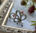 胸元に飾ったり、スカーフ留めにしたり。。。いろいろコレクションしたくなる、個性的なアンティークブローチです♪ 赤のビーズのような部分のコーティングが剥がれていますが、雰囲気を損なわない程度です。実物は写真よりくすんだ色で、剥がれはあまり目立ちません。