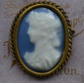 ブルーにホワイトの陶板に、風合いを増した真鍮フレームがとても素敵なアンティークブローチ。写真のように、裏側の留金がかろうじて少し残っている程度です。実用の際はご注意くださいませ。