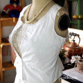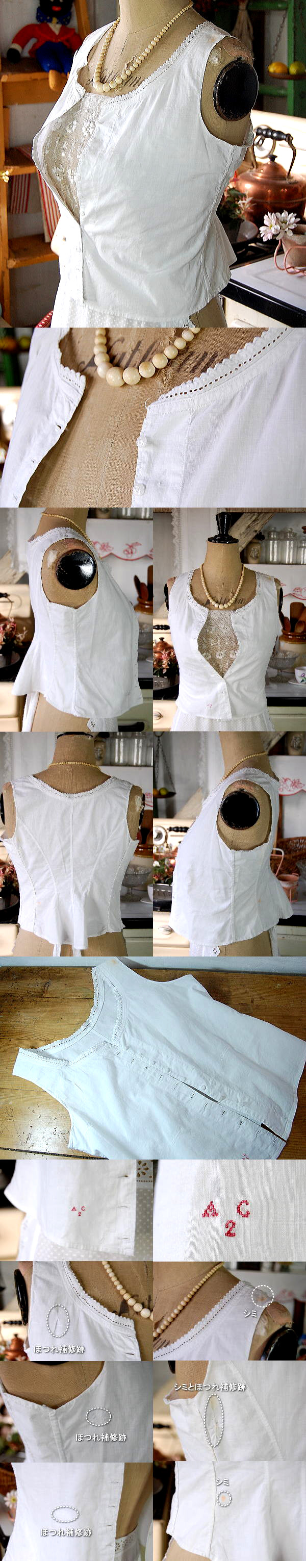 汚れや補修跡がありますが、レースなどでパッチワークしたりしてうまく補修してお使いいただけます♪ 細身のトップです。 ※ボタンの位置が少しずれています。インナーのレースは含まれません。