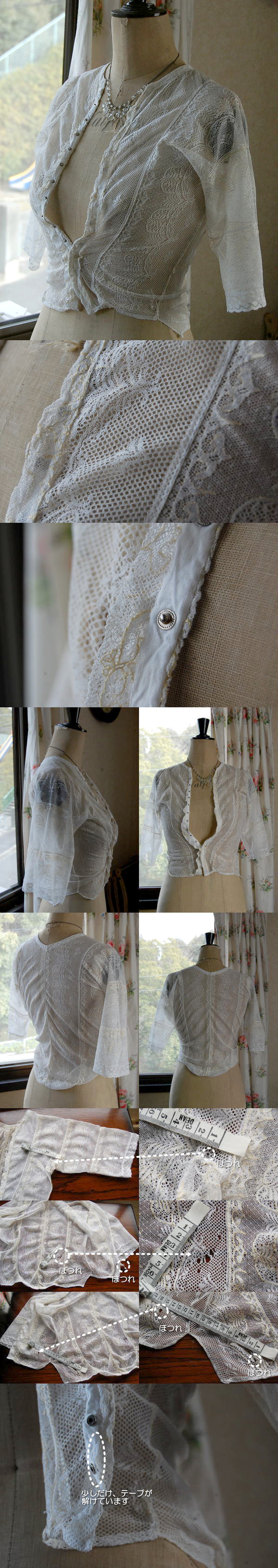 薄いコットンレースが素敵なアンティークブラウス。サイズはかなり小さめで、7号?5号くらいかと思われます。7?9号サイズ程度の方ですと、前を開けて着ていただけるかと思います。 ※軽く、漂白・洗濯済みです。