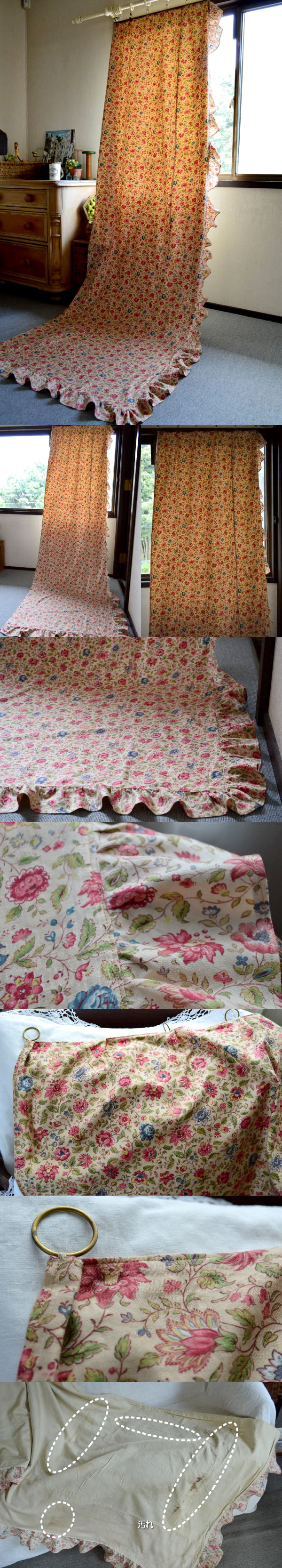 総花柄のチンツ模様が素敵なアンティークカーテン。比較的薄めの生地ですが、裏地付きで、しっかりとした作りです♪ とても雰囲気があります! 写真のように裏側の汚れと、リングが一つないですが、それ以外は、気になるダメージなく良い状態です。補修してお使いいただいても、生地としてお使いいただいても。 ※洗濯済みです。
