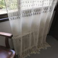 編み方の手法は従来のフィレレースと同じような作りのリネンレースカーテン。ひと目ひと目丁寧に作られた編み目がシンプルで素敵です♪ 色はベージュっぽい生成り。写真のような汚れがありますが、あまり目立ちません。 ※洗濯済みです。