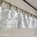 横に細長いアンティークカーテン。カフェカーテンとしてお使いいただいても、目隠しカーテンとしてお使いいただいても。やわらかな綿地に、丁寧なカットワーク手刺繍、しっかりと編み込まれたボビンレースが素敵です。※洗濯済みです。