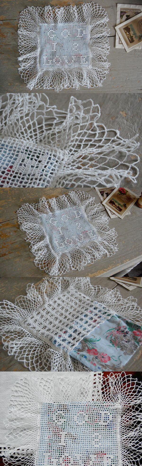 細かなコットンクロシェレースが素敵な、ハンカチを入れるアンティークハンカチケース。ハンカチを入れる部分に小さなクッションを入れて、ミニクッションを作っても素敵ですネ! ヴィンテージハンカチ付です。 ※軽く、漂白・洗濯済みです。