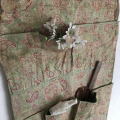 古びた風合いで、落ち着いてとても雰囲気のあるアンティークシューラック。雰囲気のいい汚れ具合です♪ 麻生地に裏地がついていますが、写真のように裏地はかなり剥がれています。麻生地部分も、肩のところがほつれていますが、後ろ側なので目立ちません。極端に重いものを入れなければ、問題のないほつれです。