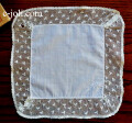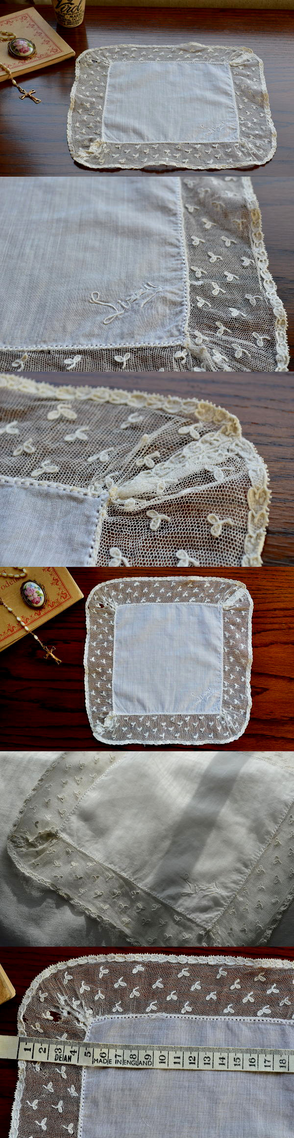 薄く繊細なコットンローン地に、とても丁寧な手刺繍と、エッジの麻糸レースがとても素敵な、アンティークハンカチです♪ 写真のようなほつれがありますが、雰囲気良いです。 ※軽く漂白、洗濯済みです。
