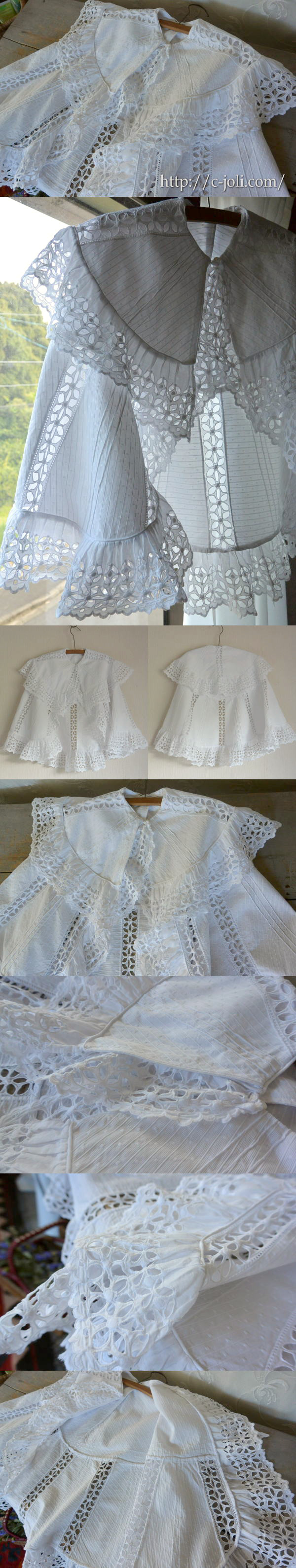 カットワーク手刺繍のフリルがとても豪華な雰囲気です!! 実用はもちろん、ドールやテディベアに着せていただいたり、お部屋に飾ったり。。。愛らしいアンティークベビーコートです♪ ※軽く漂白、洗濯済みです。