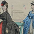19世紀フランスのファッションカタログ。イラストの下に書かれている文字は、販売しているお店の名前や住所が書かれています。フレームに入れて是非飾りたいアンティークカタログです♪