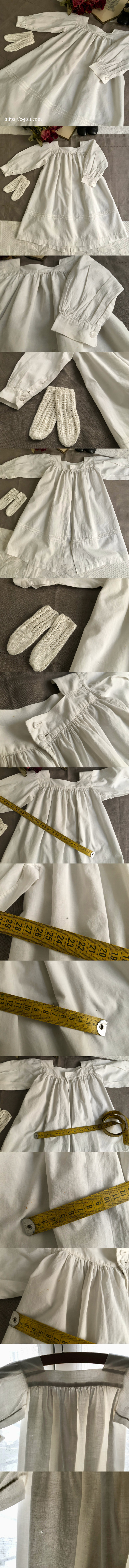 やわらかなコットン地のシンプルなベビードレスと、後年に作られた小さなニット靴下がとても可愛いです。ドールやテディベアに着せていただいたり、お部屋に飾って楽しんでいただいても。写真のように、小さな汚れやほつれがありますが、雰囲気は良いです。 ※洗濯済みです。