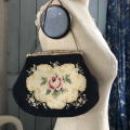 黒のベースに施された薔薇のプチポワンや、口金のフィリグリーがとても素敵なアンティークバッグです♪ 写真のように、口金が少し開いています。