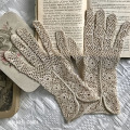 リネン糸の細かなレース編みがとても素敵なアンティーク手袋。レース手袋をはめるだけで、エレガントな雰囲気になりますね! モデルの手のサイズは標準より少し大きめですが、ゆったりとしたサイズですので、大きめサイズかと思われます。 ※洗濯済みです。