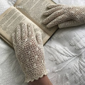 リネン糸の細かなレース編みがとても素敵なアンティーク手袋。レース手袋をはめるだけで、エレガントな雰囲気になりますね! モデルの手のサイズは標準かと思われます。色は濃い生成りです。 ※洗濯済みです。