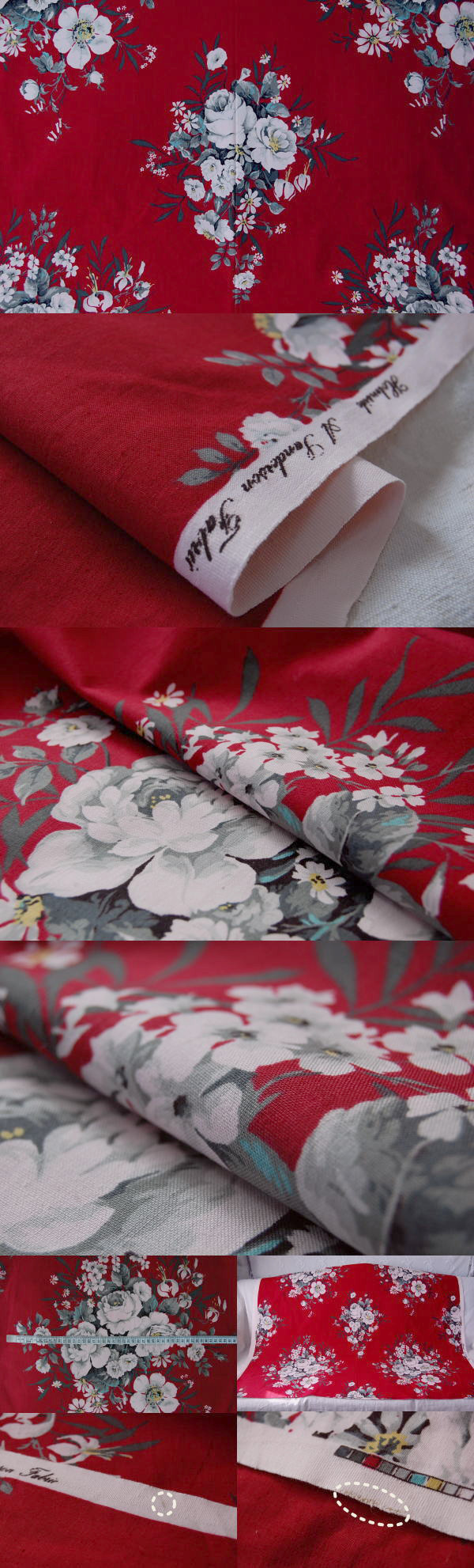 比較的厚みがあり、しっかりとしたタイプのコットンファブリック。落ち着いた赤にピンクの薔薇のデザインが素敵! イギリスサンダーソン(Sanderson)社のものです♪ デッドストック品。