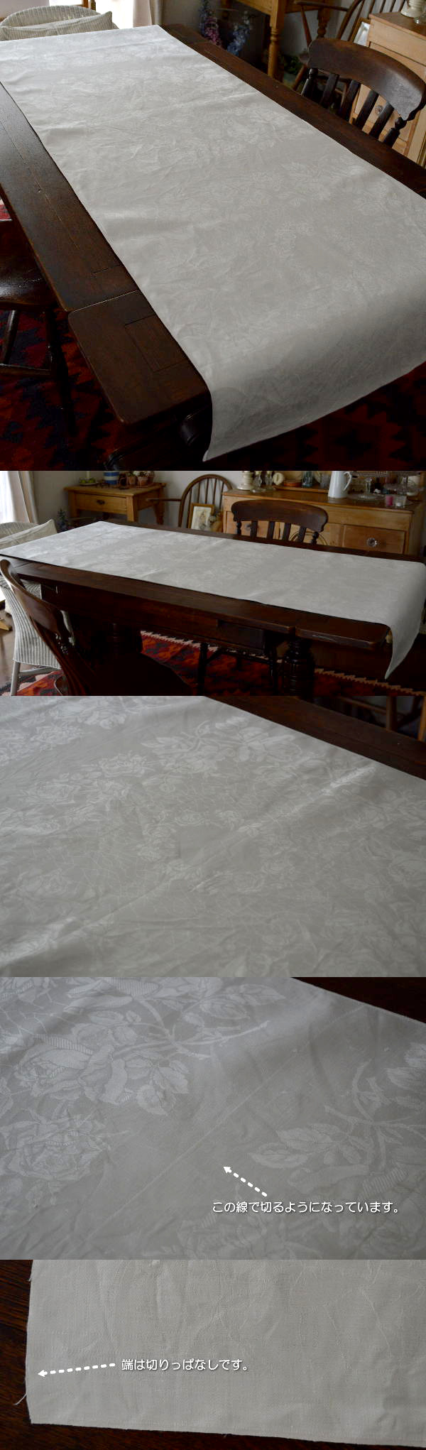 ある程度の厚みがあり、光沢ある美しいダマスク織の、とても長いリネンクロス。65x66cmのクロスが3枚つながったものですが、切らずに、テーブルランナーとしてお使いいただけます♪ 少ししわが目立ちますが、半乾きの状態でアイロンを掛けていただくと、しわは目立ちません。2点ご注文の場合は、切らずに発送させていただきます。(65cmx396cmになります)※軽く、漂白・洗濯済みです。