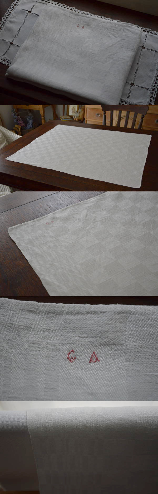 使い込まれた風合いが素敵な、ダマスク織アンティークリネンクロス。キッチンクロスとしてはもちろん、テーブルクロスとしてもお使いいただけます♪ ※軽く、漂白・洗濯済みです。