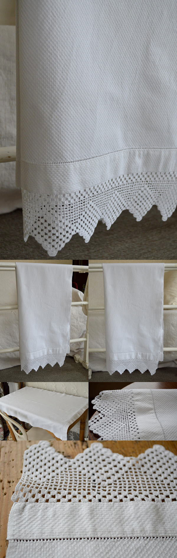 ハンドタオルとしてはもちろん、テーブルクロスとしてお使いいただいたり、小窓のカーテンとしてお使いいただいたり。エッジのクロッシェレースがとても素敵なアンティークリネンタオルです♪ ※軽く、漂白・洗濯済みです。