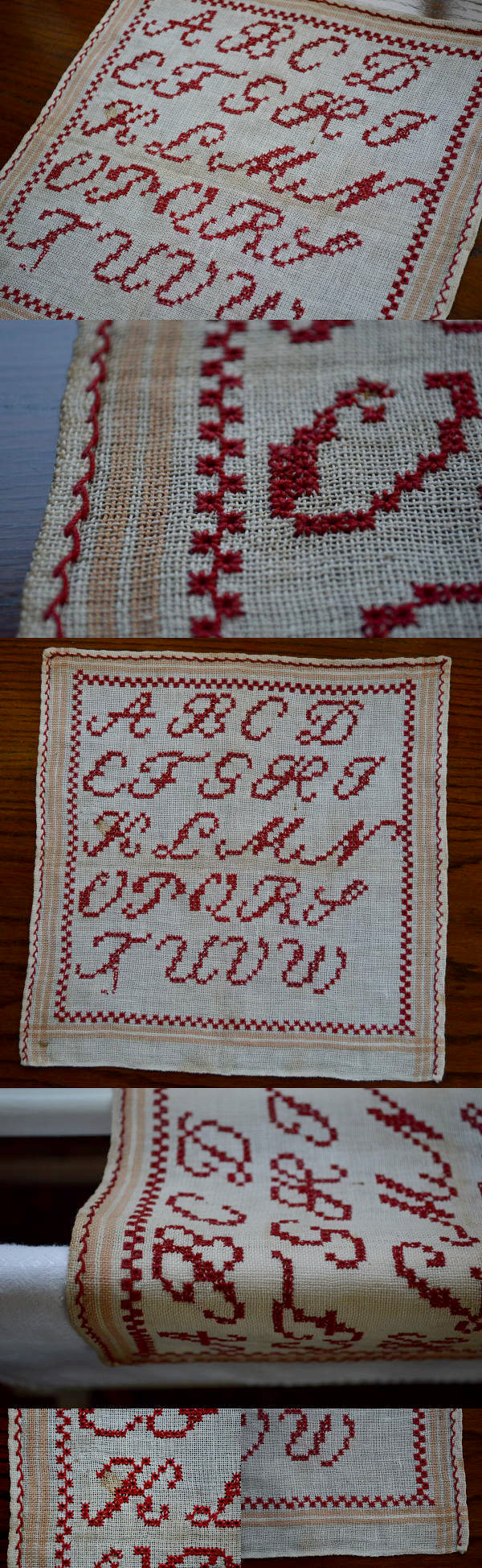くったりとした麻生地に、一針 一針丁寧に手刺繍されたサンプラー。アンティークでしか味わえないとても素敵な雰囲気です! お気に入りの額に入れて素敵に飾っていただいても♪