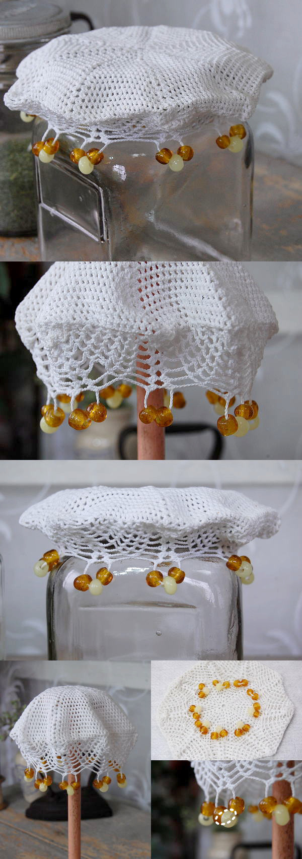 古いガラスビーズにコットンレースが素敵なジャグカバーです♪
