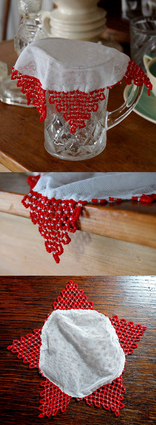 ジャグカバーとしてもレースマットとしても素敵ですね♪ チュールレースに細かなガラスビーズ。