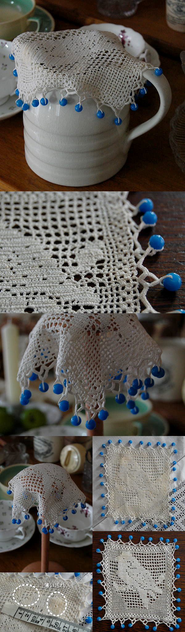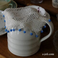 古いコットンレースにガラスビーズが素敵なジャグカバー。ドイリーとしてお使いいただいても可愛いですネ! 写真のように、ガラスビーズがなくなっている箇所があります。