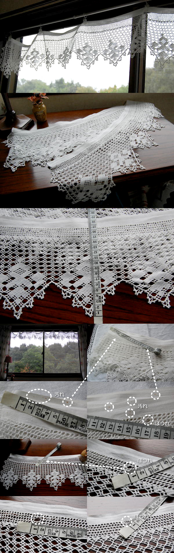 細い糸で比較的ゆったり編みこまれたアンティークレース。お洋服のヘムレースにしたり、シェルフランナーとしてお使いいただいたり。。。とても長くて、いろいろお使いいただける幅広レースです! 写真のように、ほつれがありますが、気にならない程度です。