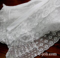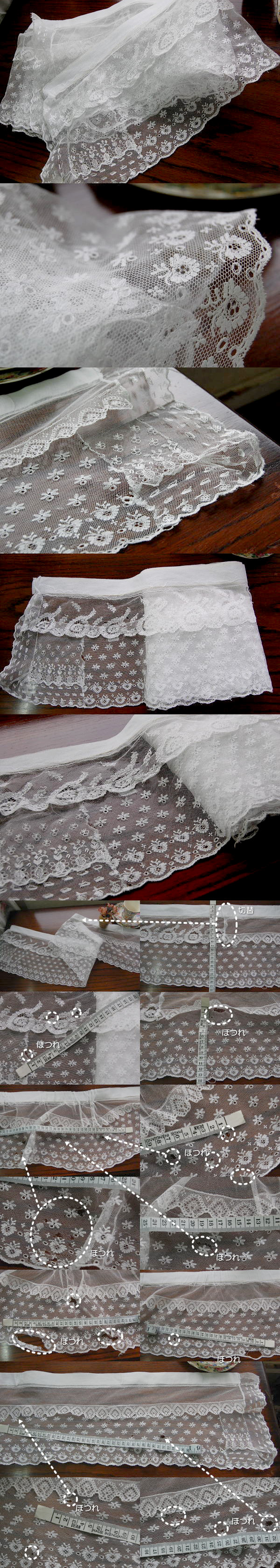 少し硬い感じの糸のコットンチュールレース。写真のようなほつれがありますので、ほつれ部分を避けて、いくつかに切り分けてお使いいただいても。。。 まだまだお使い頂きたいアンティークです♪ ※軽く、漂白・洗濯済みです。