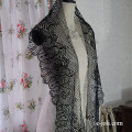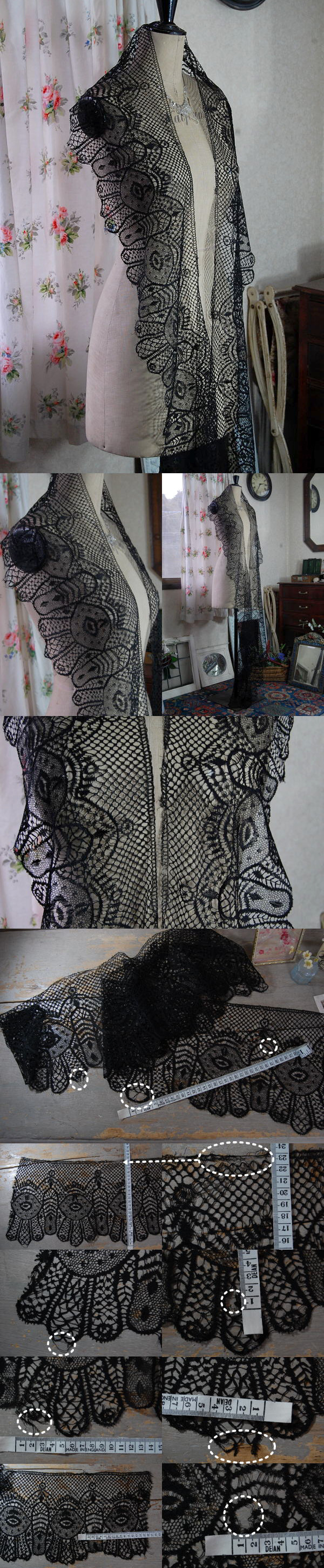 ストールとしてもお使いいただけそうな、幅広サイズの黒レース。繊細で、気品のある雰囲気ですネ! 写真のようなほつれがありますが、古いリネンですので、雰囲気があって良い感じです。 ※軽く、洗濯済みです。