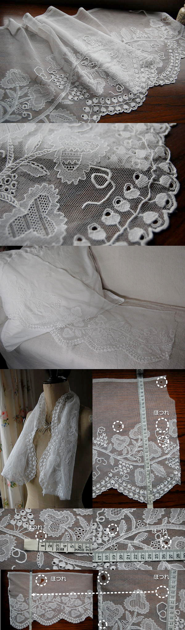 やわらかなコットンのアンティークレース。写真のような大きなほつれがありますので、切り落として幅を狭くしてお使いいただいても。。。まだまだお使いいただきたいアンティークです♪ ※軽く、漂白・洗濯済みです。
