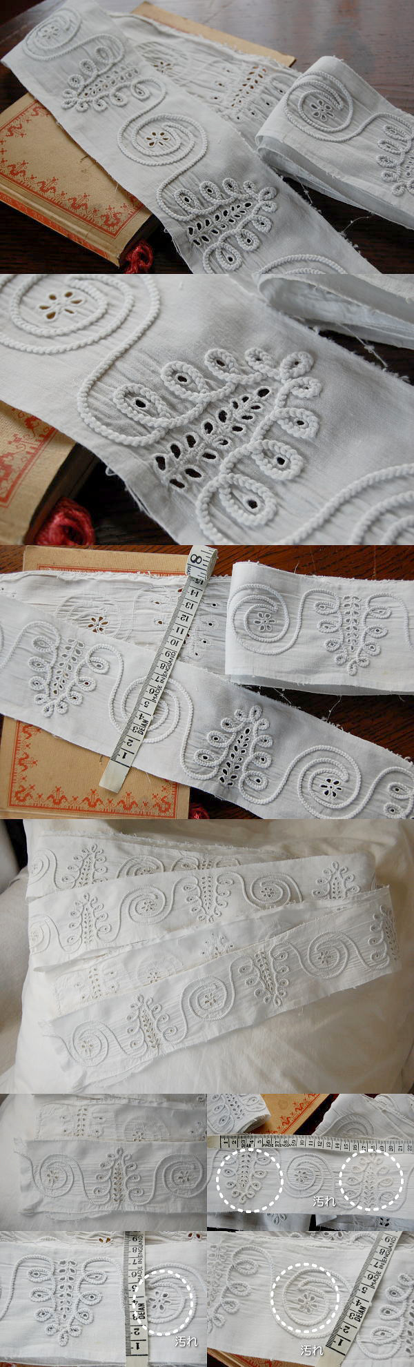 ハンドメイドにたっぷりお役立ていただける、アンティーク手刺繍クロスです♪ 写真のような、薄く黄色っぽいシミがありますが、雰囲気を損なわない程度です。 ※軽く、漂白・洗濯済みです。