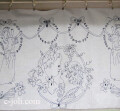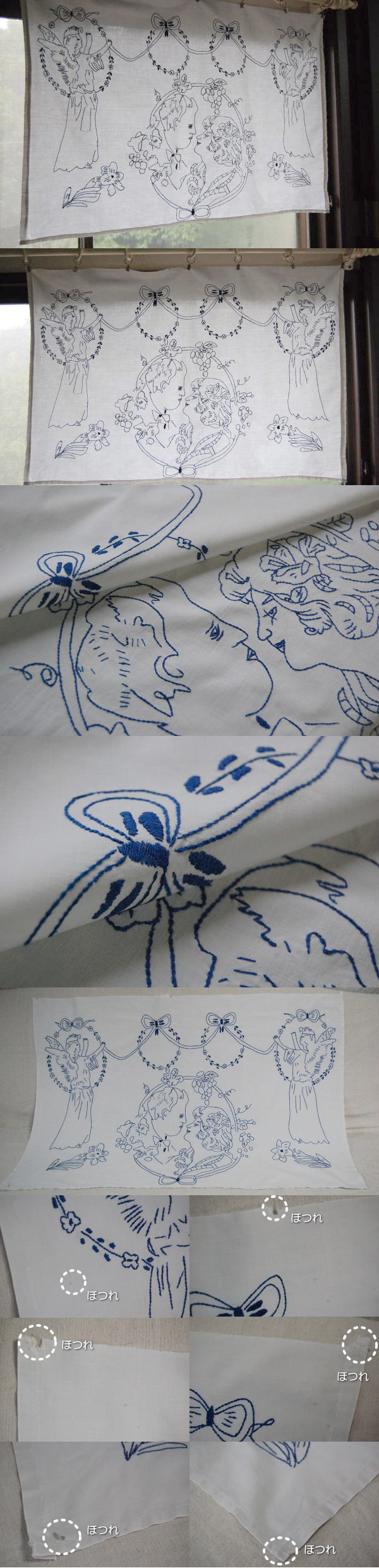 薄い綿生地に、ブルーの刺繍がとても素敵なコットンクロスです♪ 写真のようなダメージがありますが、雰囲気を損なわない感じです。 ※軽く、カラー漂白・洗濯済みです。