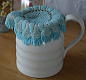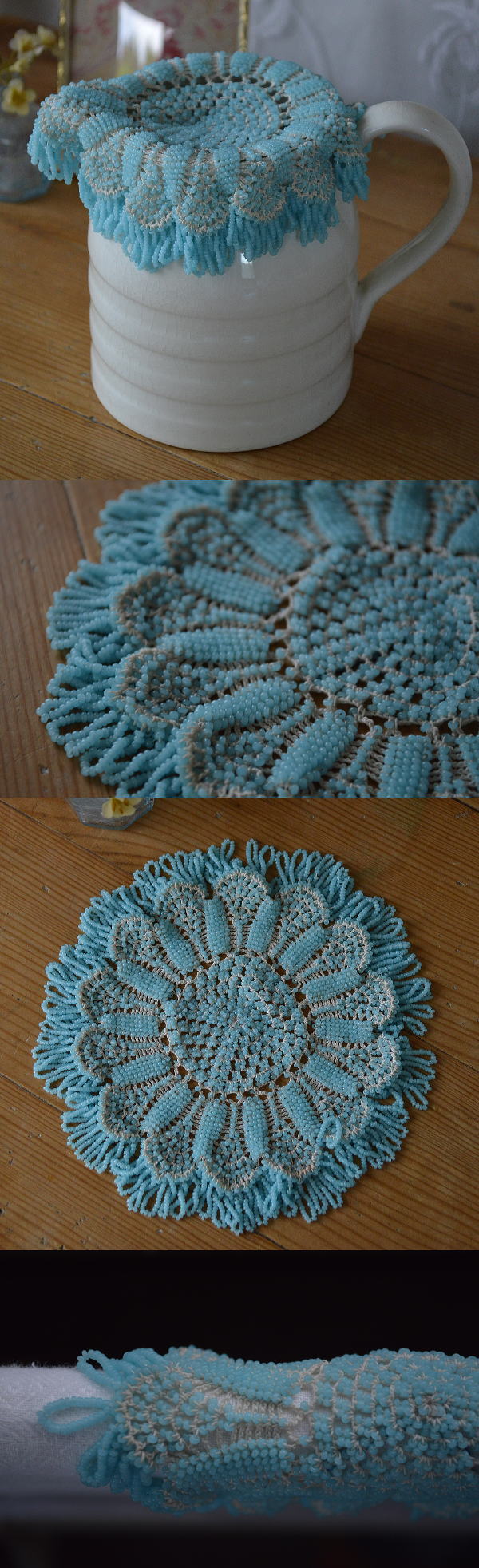 細かなレース編みに、ガラスビーズが編みこまれた、とても素敵なジャグカバーです♪