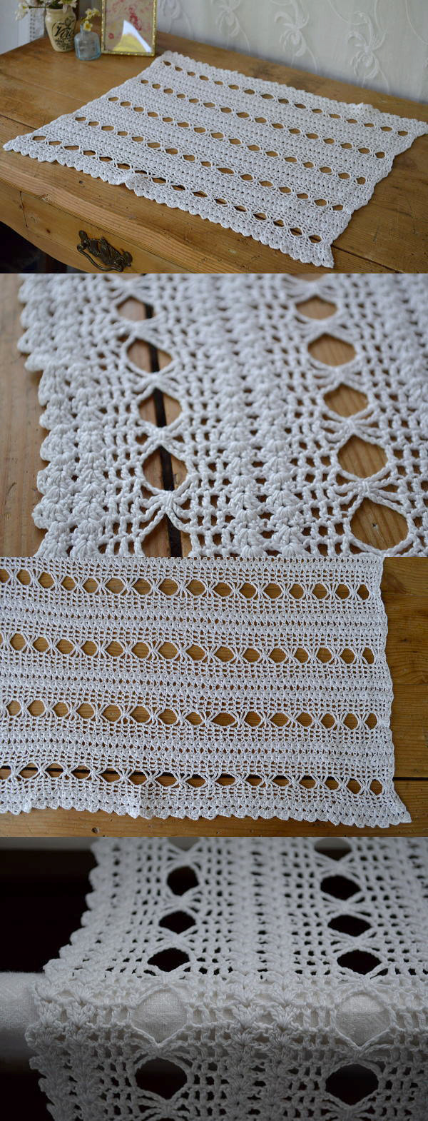 少し太めの糸で、がっしりと編みこまれた、素朴な風合いのアンティークレースクロス。写真のように、形に歪みがありますが、気にならない程度です。 ※軽く、漂白・洗濯済みです。