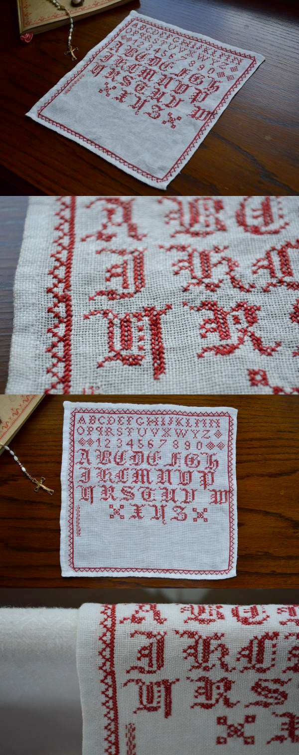 リネンネットベースに、とても丁寧に手刺繍されたアンティークサンプラー。フレームに入れて飾ったり、ハンドメイドにお役立てください♪ ※軽く、漂白・洗濯済みです。
