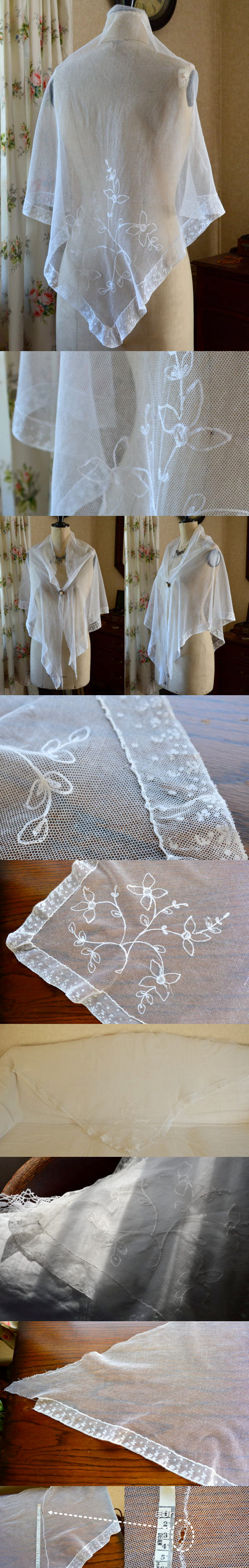 とてもやわらかく繊細なコットンチュールレース。ショールとしてお使いいただいても、ベールとしてお使いいただいても。写真のようなほつれがありますが、うまく工夫してお使いください。 ※軽く漂白、洗濯済みです。