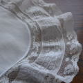 薄く張りのある麻ローン地に、とても細かく繊細な、ホワイトワークが見事な、アンティークリネンクロスです♪ フレームに入れて飾っていただいても、テーブルマットとしてお使いいただいても。 ※軽く漂白、洗濯済みです。
