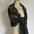 さりげない光沢のシルクレースが素敵な、ブラックレースショール。美しい黒の気品あるレースです♪ 写真のようなほつれがありますが、雰囲気を損なわない程度です。※水洗い済みです。
