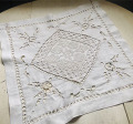 少しグレーっぽくて光沢ある麻生地に、丁寧なカットワーク手刺繍、手作業のフィレレースがとても素敵です! 写真のようなほつれや汚れがありますが、雰囲気良いです。 ※軽く、漂白・洗濯済みです。