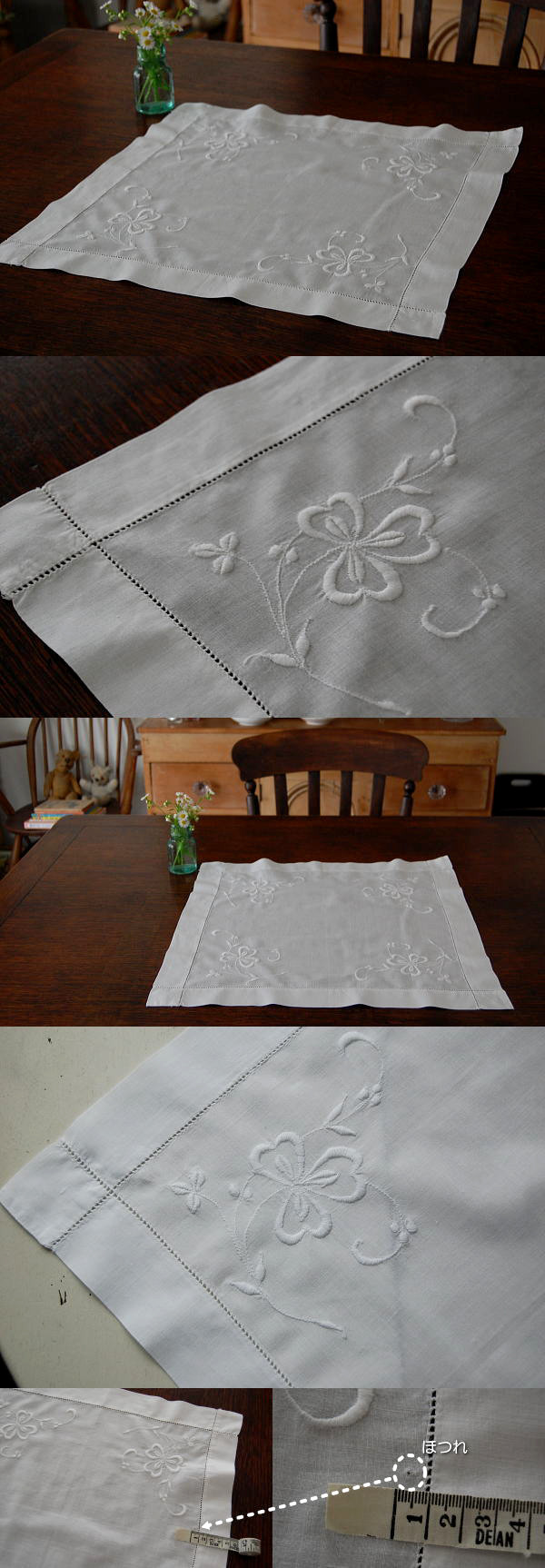 テーブルのセンターで使ったり、チェストの上で使ったり。。。いろいろな場所で使えるアンティークテーブルマット(テーブルトップクロス)。オークテーブルにも、パインテーブルにも合いますネ♪ 小さなほつれがありますが、気にならない程度です。 ※軽く、漂白・洗濯済みです。