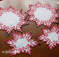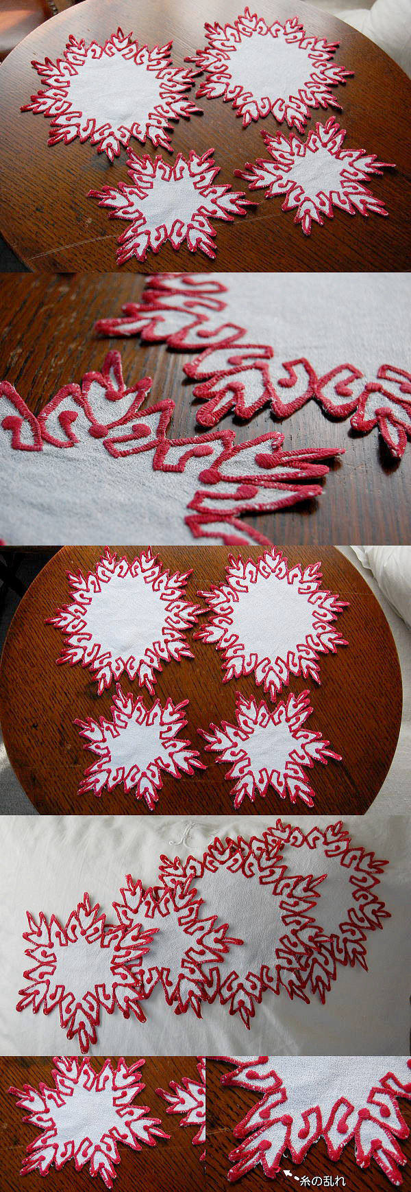 光沢があって、高級感がある麻生地に、赤の刺繍が魅力的な、レースドイリーのセットです♪ ※軽く、漂白・洗濯済みです。