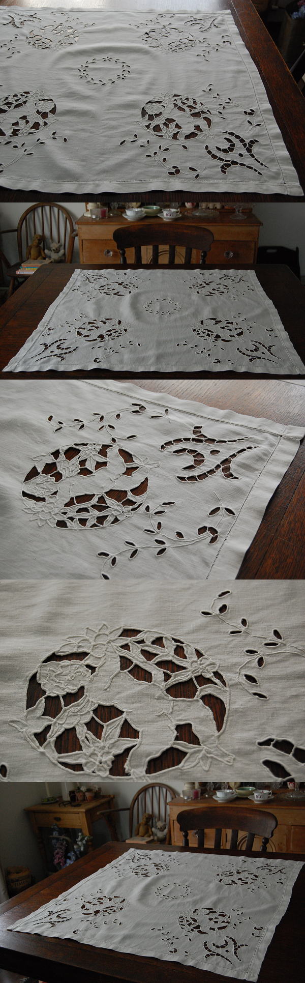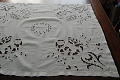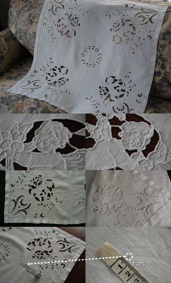 くったりと風合いを増した麻生地に、天使柄のカットワーク手刺繍がとても素敵なテーブルクロスです♪ ※軽く、漂白・洗濯済みです。