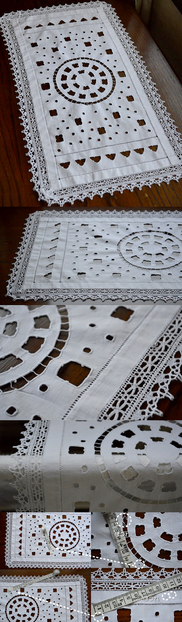 繊細な麻生地に、丁寧なカットワーク手刺繍とエッジのレースがとてもエレガントで素敵なアンティークリネンクロスです♪ 写真のように、小さなほつれがありますが、雰囲気を損なわない程度です。 ※軽く、漂白・洗濯済みです。