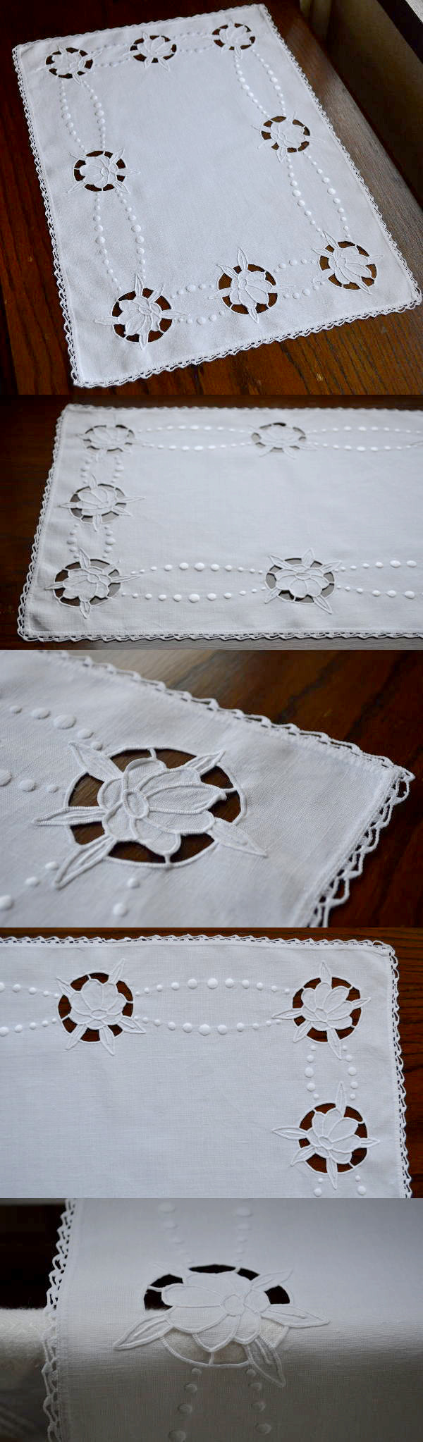 薄く張りのある麻生地に、丁寧なカットワーク手刺繍とエッジのレースがとても素敵なアンティークリネンクロスです♪ ※軽く、漂白・洗濯済みです。