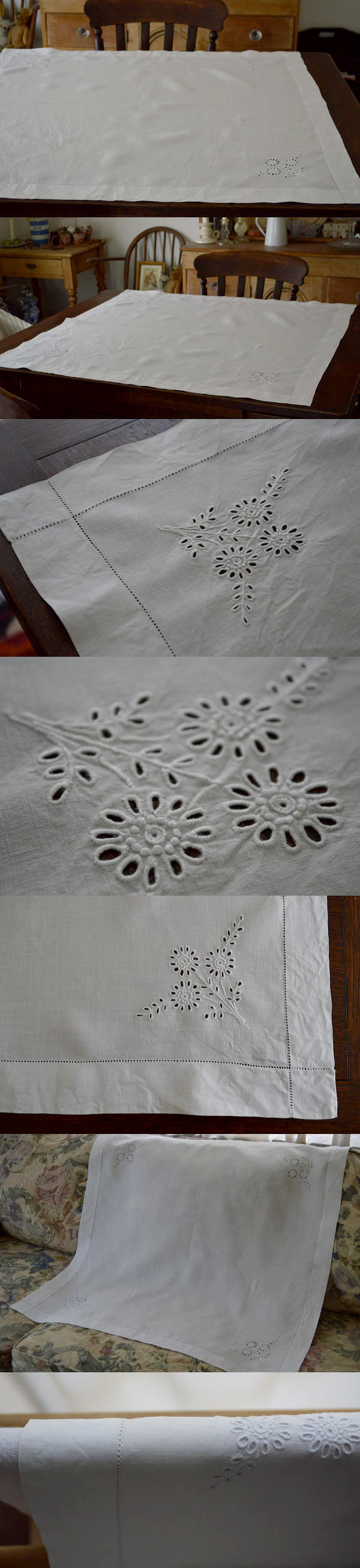時を経た風合いが素敵な麻生地に、素朴な風合いのカットワーク手刺繍が素敵なアンティークリネンクロスです♪ くったりとした雰囲気の良いリネンです。 ※軽く、漂白・洗濯済みです。