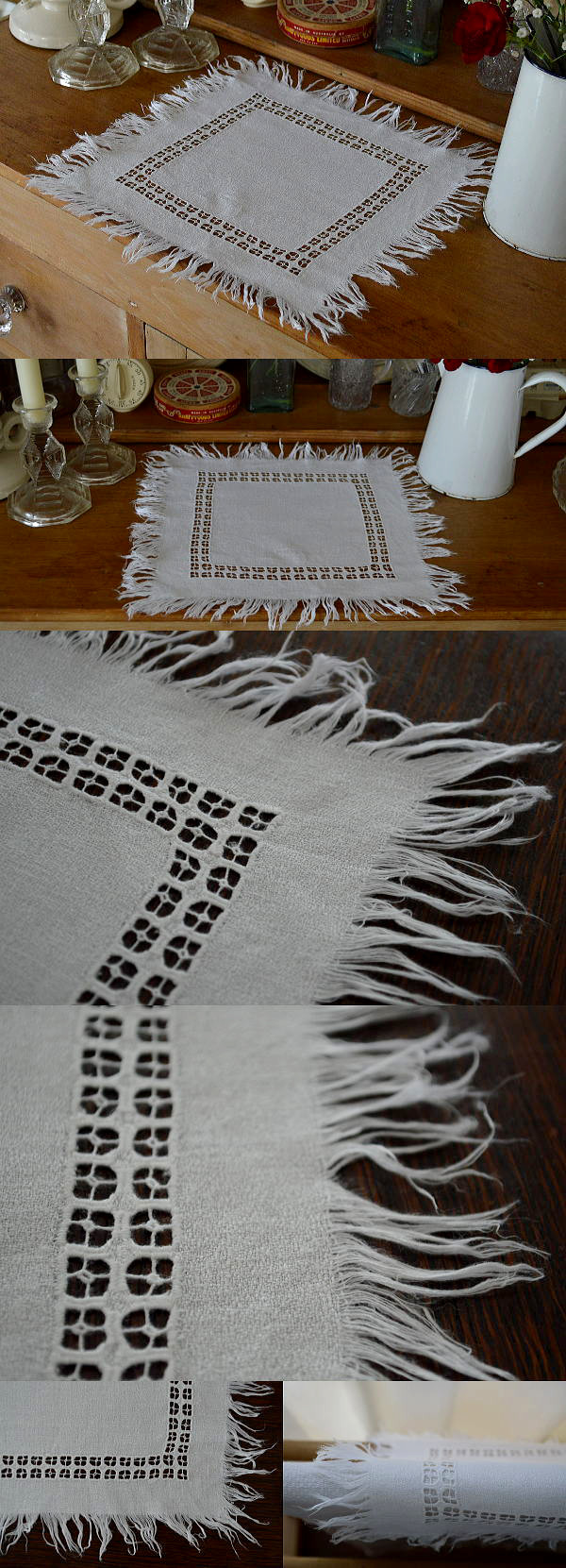 ある程度の厚みがあり、光沢ある美しい麻生地に、丁寧なカットワーク手刺繍とフリンジが素敵なテーブルマットです♪ ※軽く、漂白・洗濯済みです。