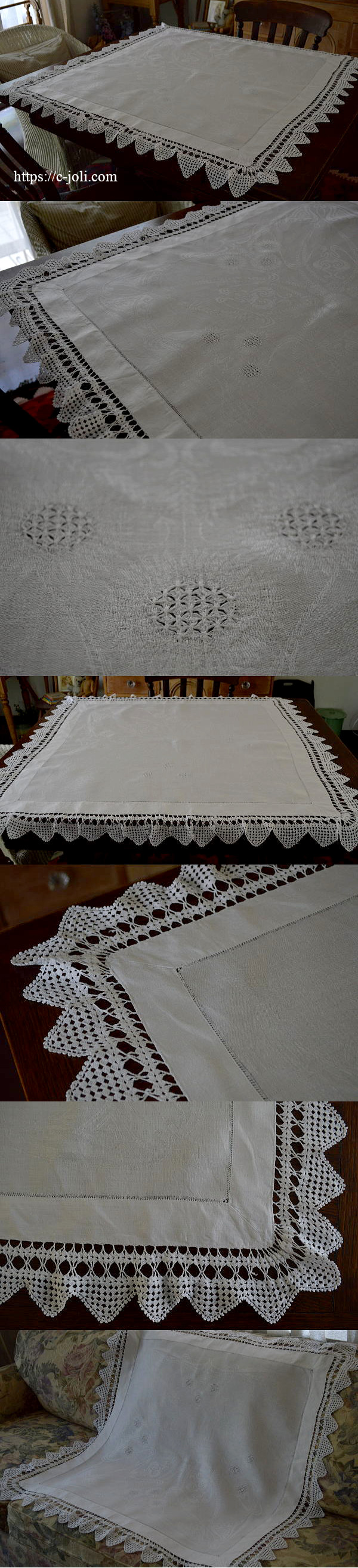 光沢があって高級感あるダマスク織の厚めの麻生地に、ドロンワークとエッジのクロッシェレースがとても素敵なアンティークテーブルクロスです♪ ※軽く、漂白・洗濯済みです。